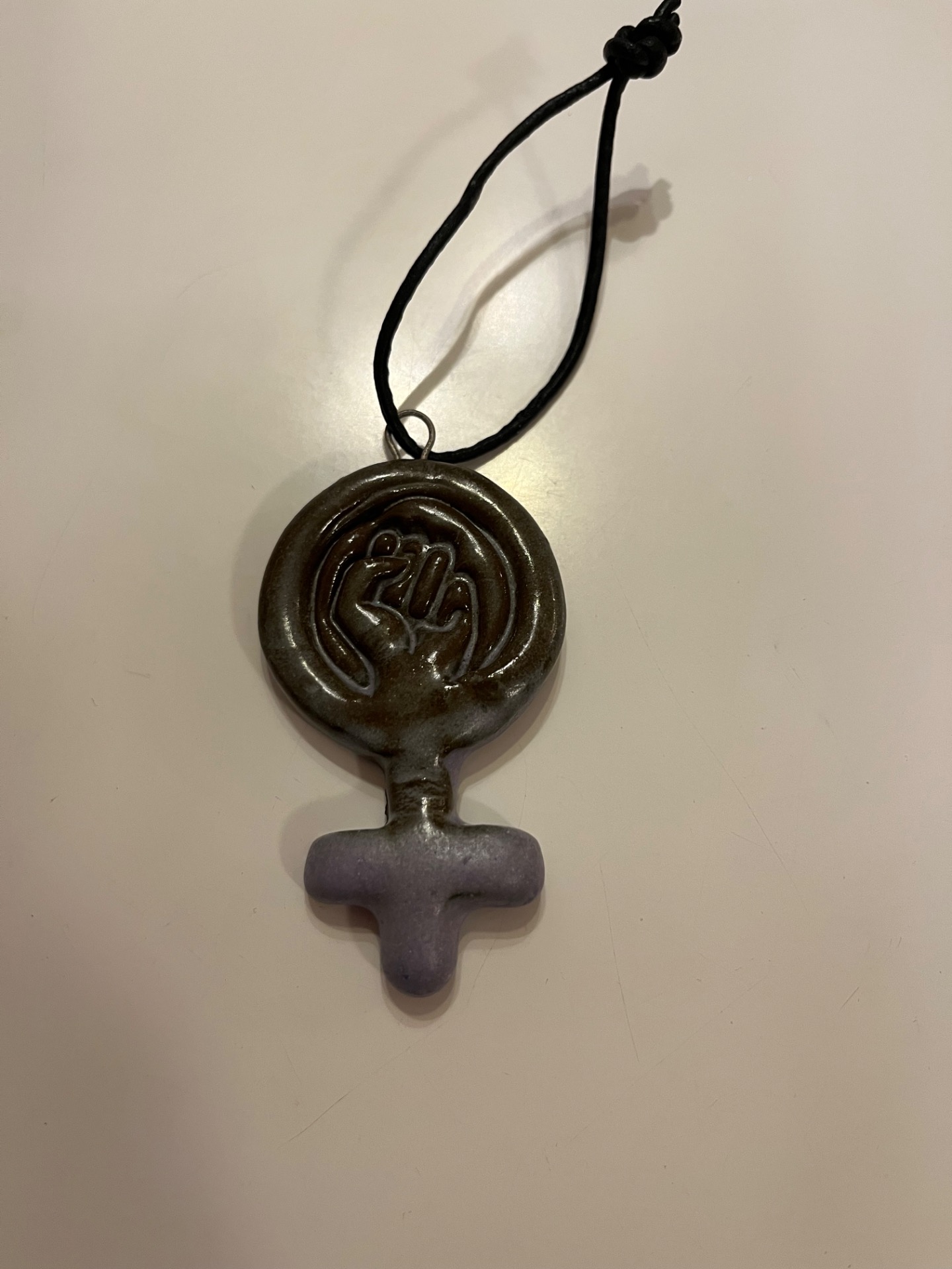 Kvindetegns ophæng. Perfekt til enhver kvinde. Kan hænge op hele året, men også på juletræet. Måler 7 cm i længden og 4 cm i bredden. Farve: sort ler med lilla glasur.