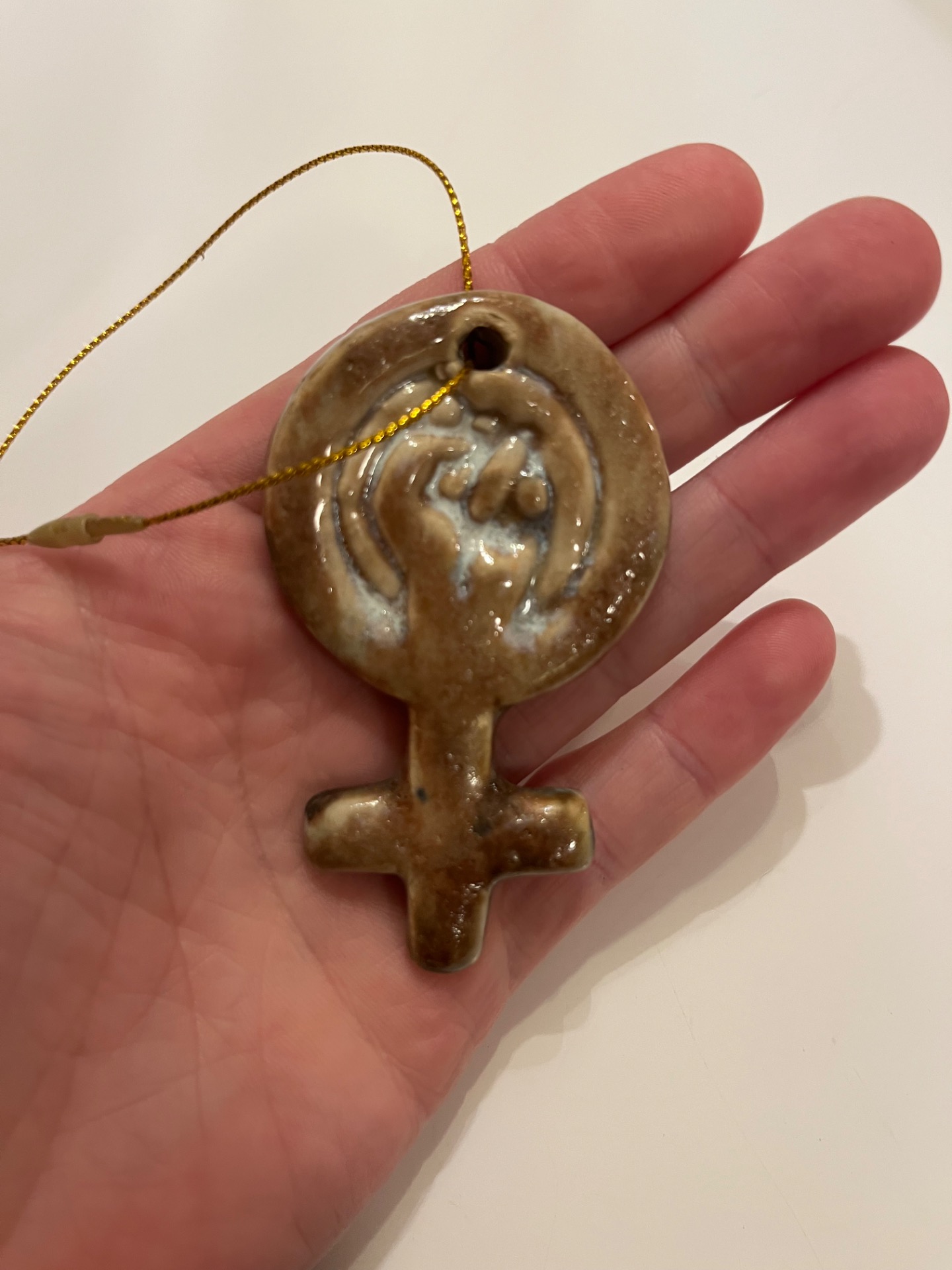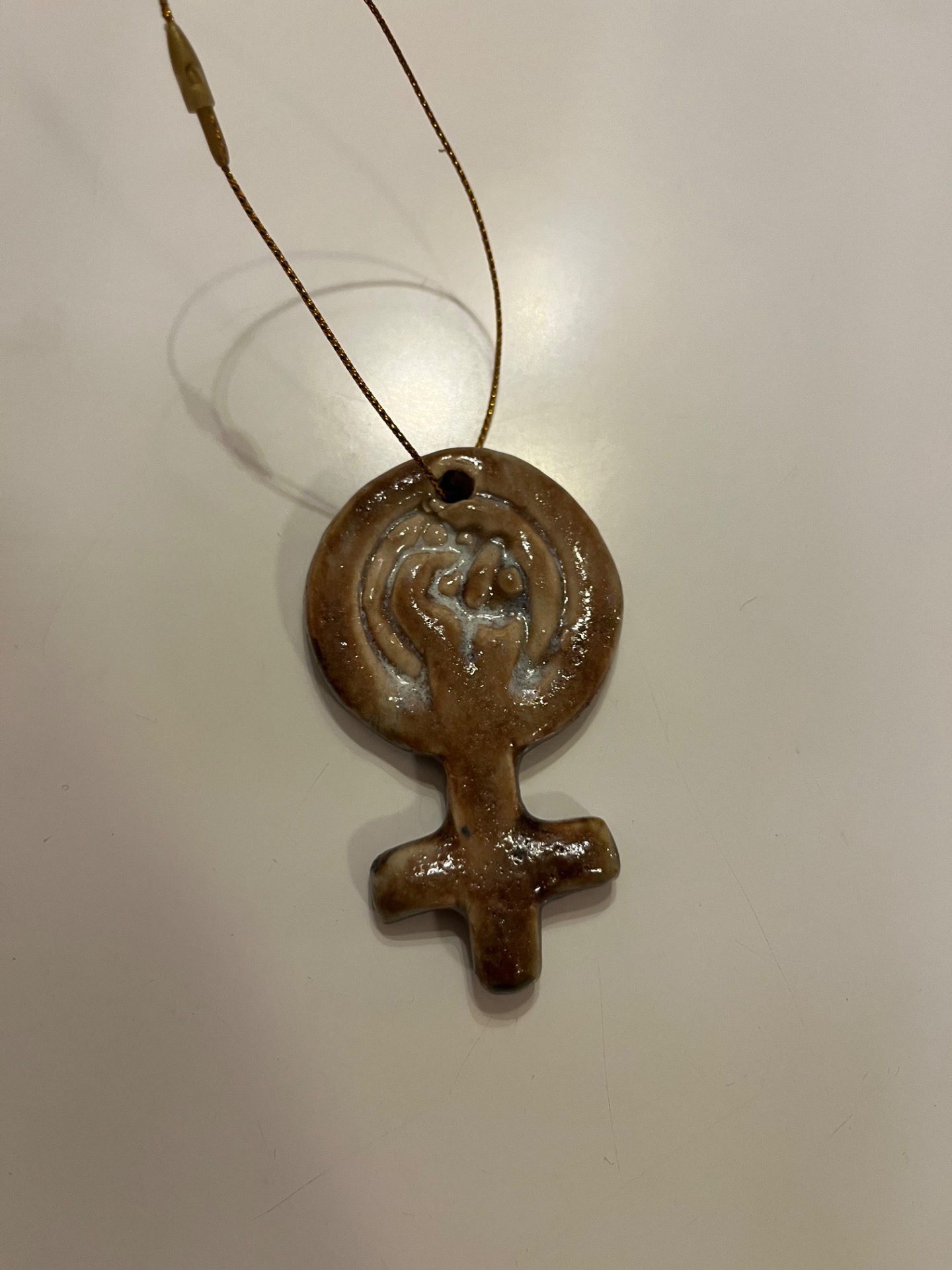 Kvindetegns ophæng. Perfekt til enhver kvinde. Kan hænge op hele året, men også på juletræet. Måler 7 cm i længden og 4 cm i bredden. Farve: brune nuancer.