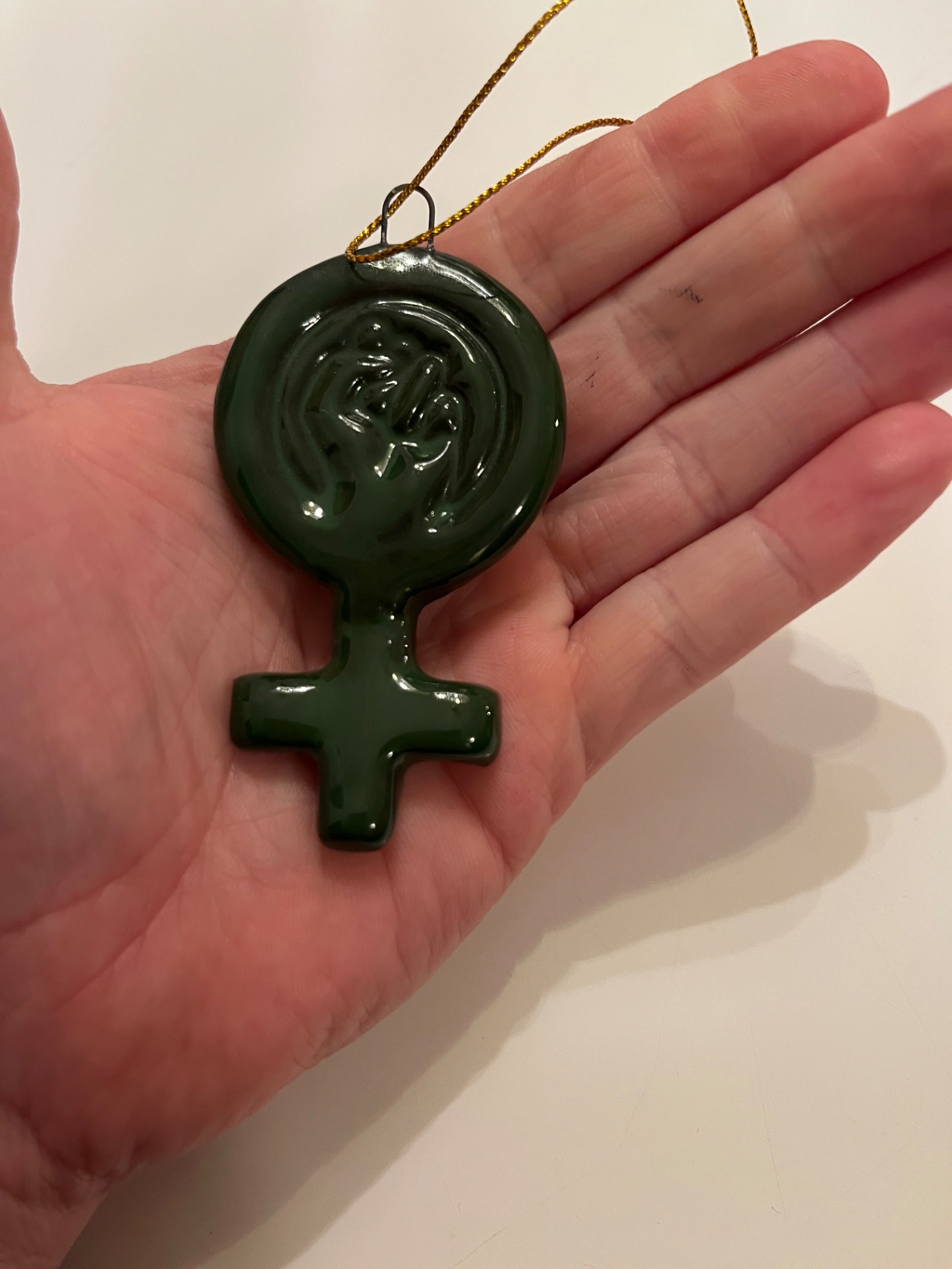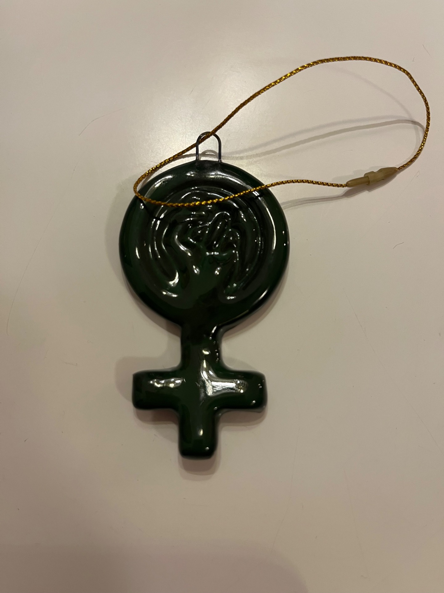 Kvindetegns ophæng. Perfekt til enhver kvinde. Kan hænge op hele året, men også på juletræet. Måler 7 cm i længden og 4 cm i bredden. Farve: mørkegrøn.